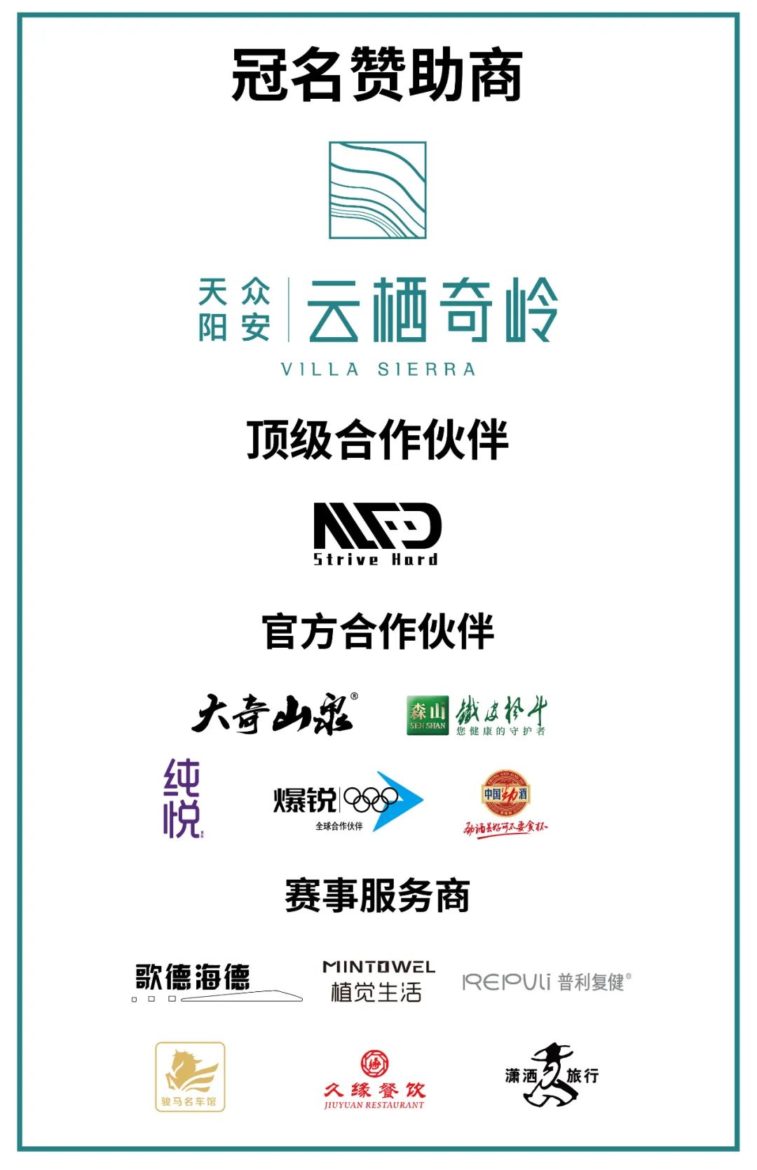 最后感谢天阳众安·云栖奇岭对本次赛事的冠名,以及努力奋斗、森山铁皮枫斗、纯悦、爆锐、中国劲酒、大奇山泉、久缘餐饮、潇洒旅行、歌德海德、植觉生活、普利复健、骏马名车行对本次赛事的大力支持。