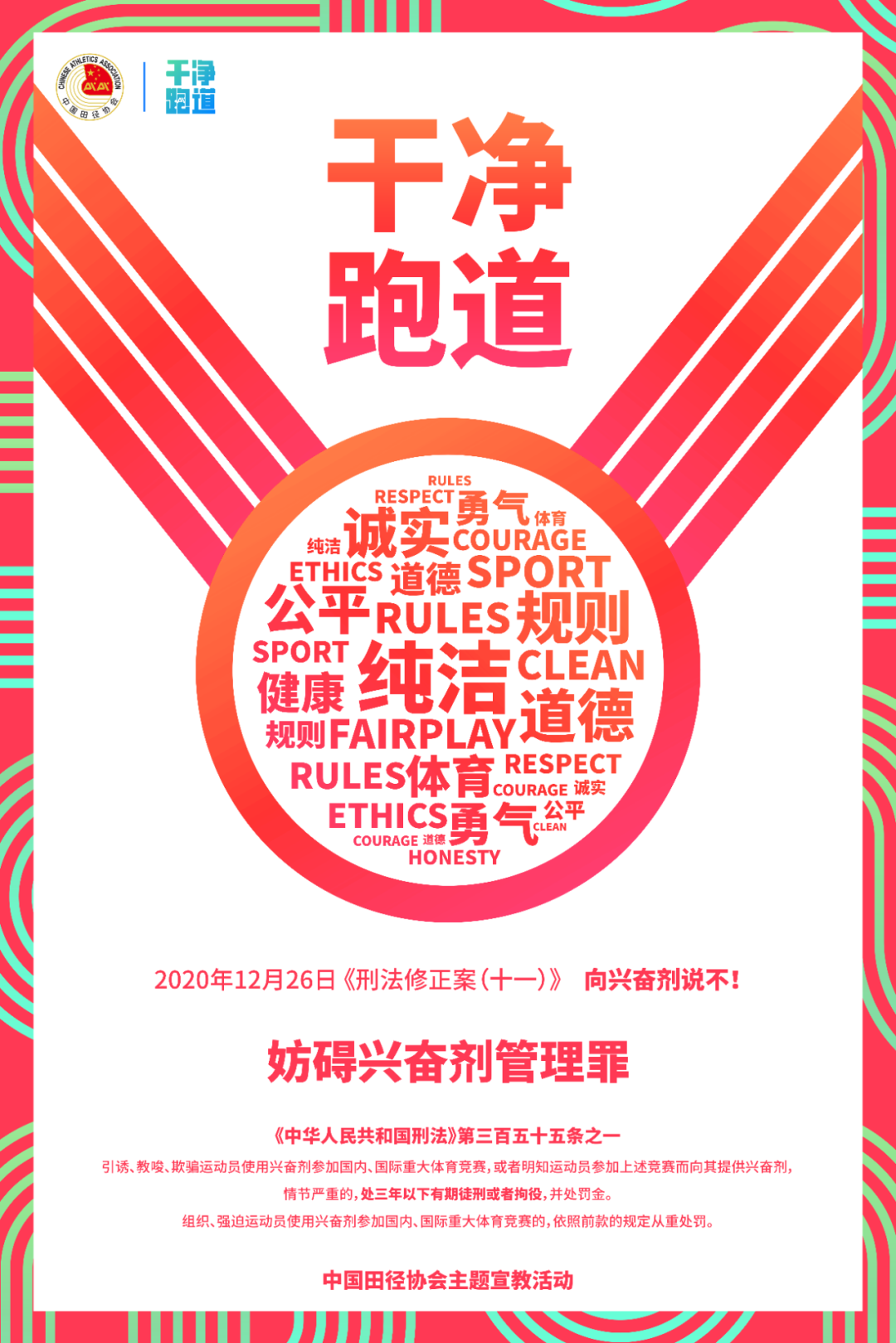 海报用数组词汇展示“干净跑道”的精神内核,并将其置于金牌之内,寓意“道德的金牌”、“风格的金牌”、“干净的金牌”需要海报中所展示的美好品质来支撑并实现。