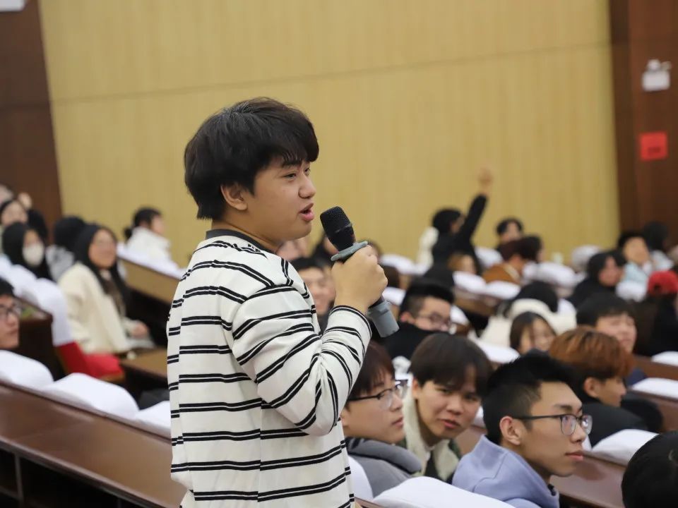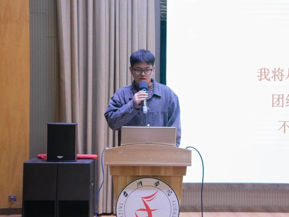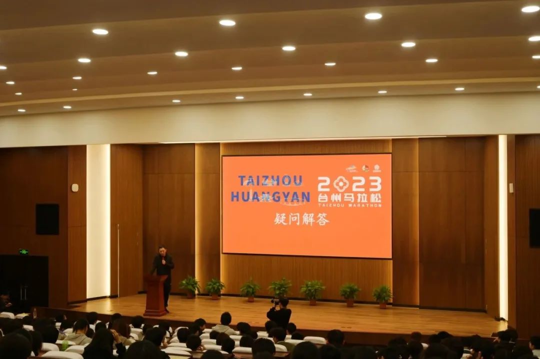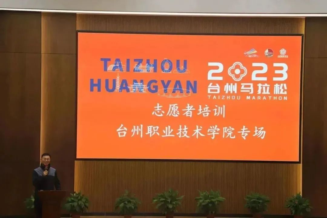 在台州职业技术学院专场培训时,台州市体育事业发展中心顾一俊上台发言致辞,为志愿者们讲解了马拉松赛事中志愿者需要注意的事项,增强安全意识。
