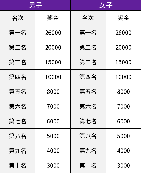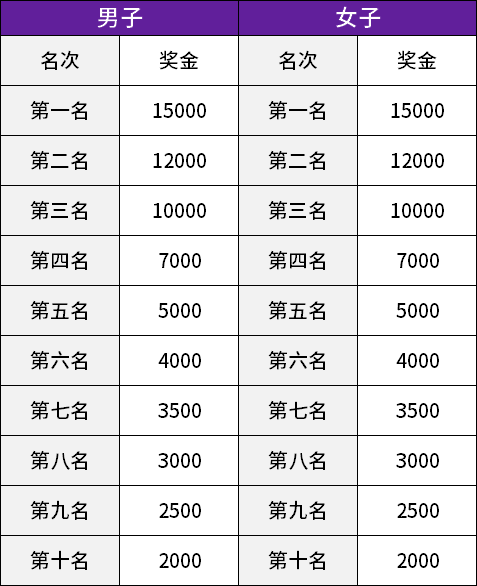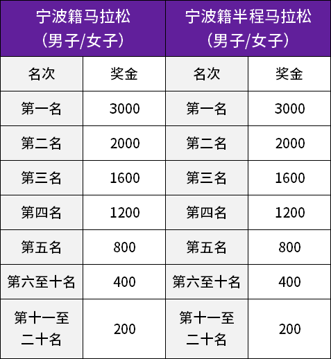 马拉松、半程马拉松宁波籍参赛者,男、女前二十名的运动员,分别获得以下奖金(人民币,单位:元):