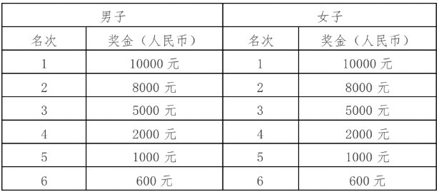 奖励办法:半程马拉松取前六名运动员,分别获得奖金(币种:人民币,见下表),半程马拉松前三名运动员各颁发奖杯一座、领奖服一套;